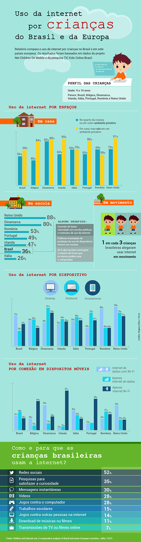 Enquanto as crianças brasileiras ainda contam com uma baixa proporção de acesso à internet na escola, uma tendência aponta para o aumento do uso em ambientes privativos. Esses são alguns dos resultados apresentados pelo relatório Crianças e o uso da Internet: uma análise comparativa entre o Brasil e sete países europeus, que traz dados de Brasil, Bélgica, Dinamarca, Irlanda, Itália, Portugal, Romênia e Reino Unido.